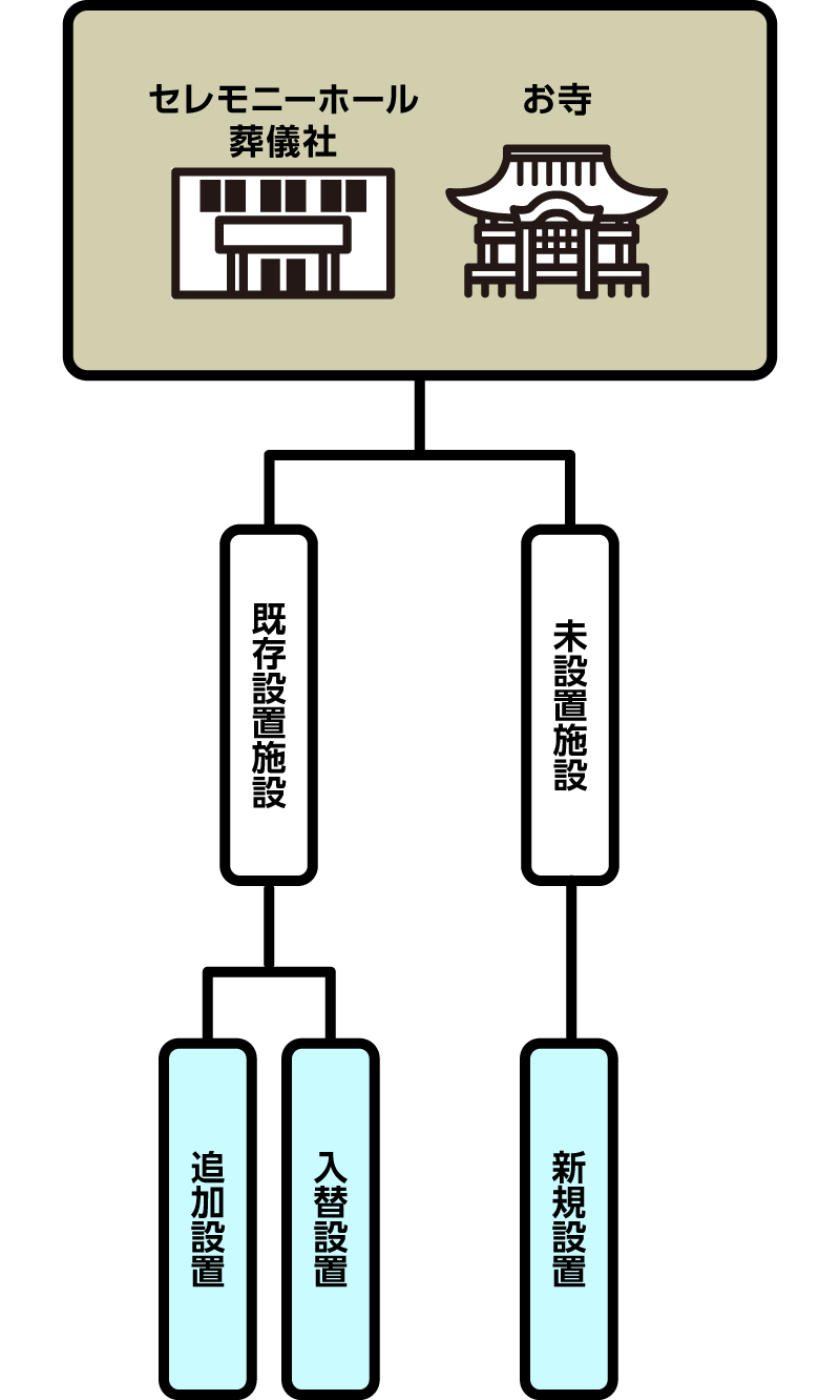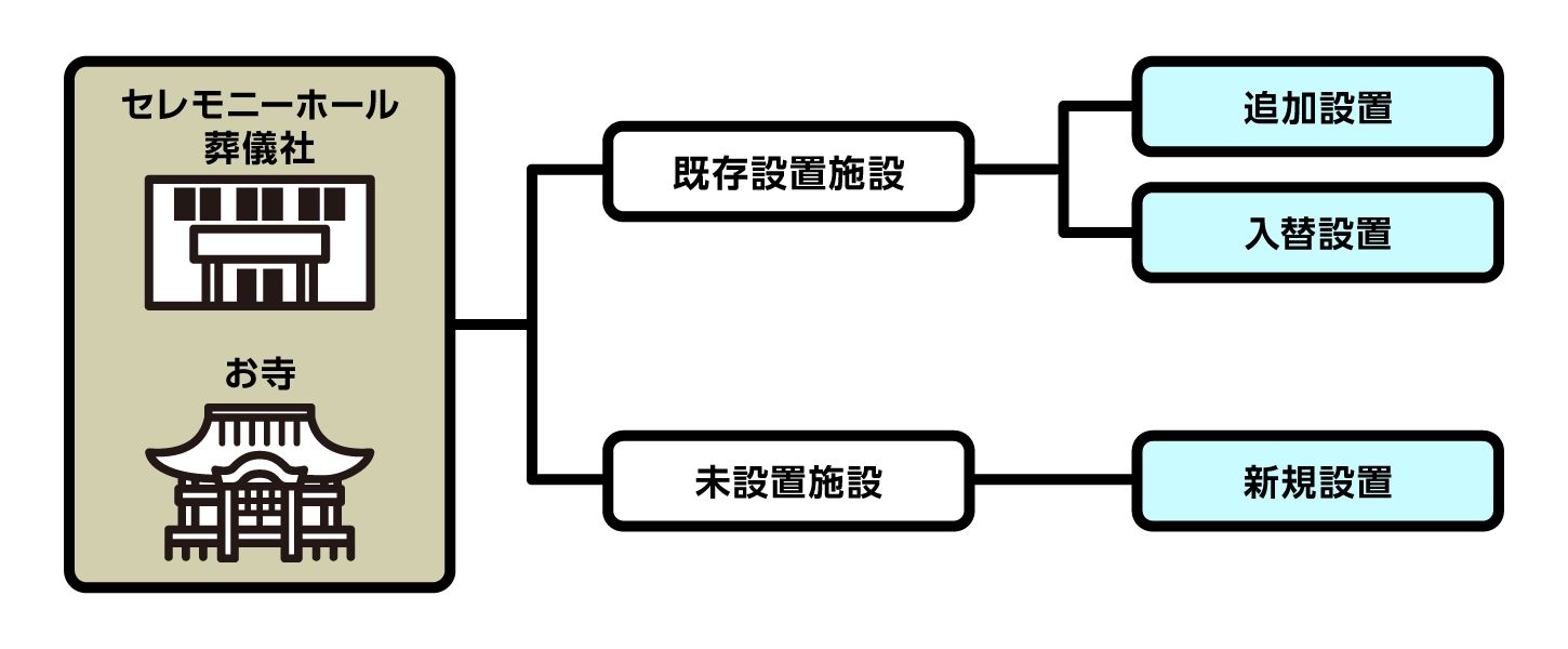 死去から葬儀までの間、ご遺体は葬儀社、セレモニーホール、寺院に安置されます。セレモニーホール(全国で10,000施設超)のうち25%程度の施設にご遺体用冷蔵庫が設置されています。従って、設置は各施設への追加、入替、新規となります。